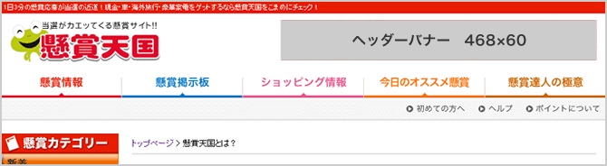 懸賞天国ではトップページ・サイドバー内のバナー、各情報ページ上部バナー・サイドバー内のバナーにて広告を受け付けております。